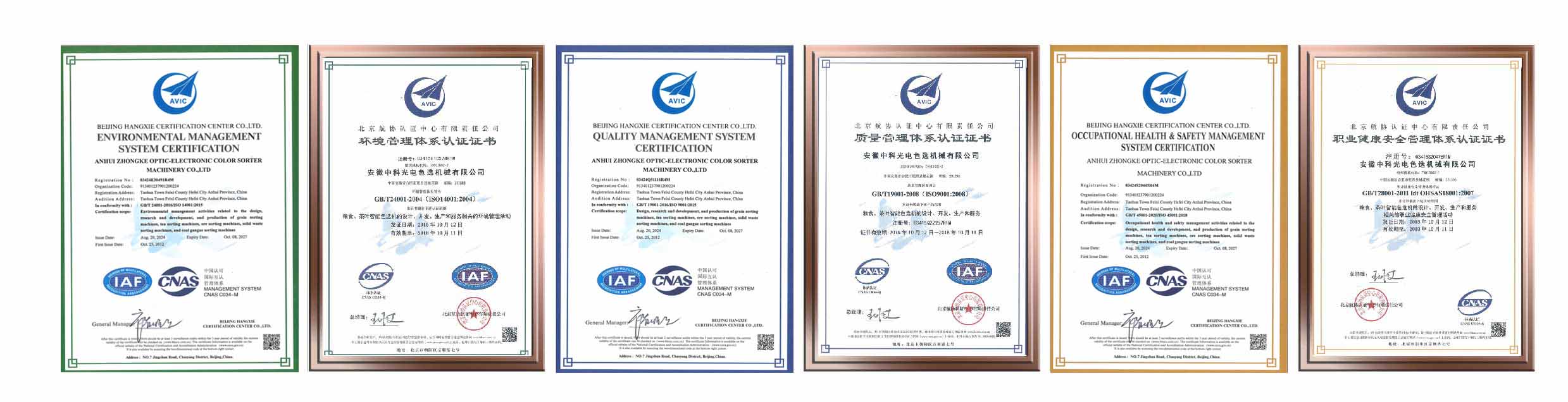 The company fully passed the quality management system certification, environmental management system certification, occupational health management system certification, and the "AMD" series of products passed the European Union CE certification. The strict quality management system guarantees the quality of the company's products and services, and has launched the "AMD" brand throughout the country and the world. "Optical sorting, we are everywhere" is the pursuit and commitment of Zhongke to color sorting technology. "AMD" series of intelligent color sorters ranked top three in the market and successfully exported to 100+ countries and regions.