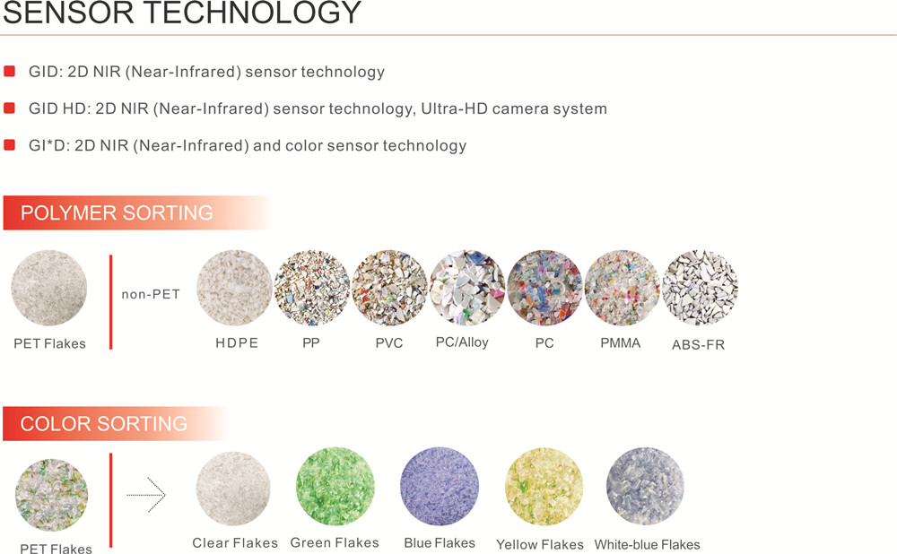 Discover AMD's advanced NIR-based sorting solutions for efficient PET and non-PET plastic separation. The high-output, low-loss AMD® GID series polymer sorter machines detect and remove non-PET flakes like PP, PC, PS, ABS, PE, PET-G, PVC, and PMMA. Integrating visible light, they sort by color and material simultaneously.