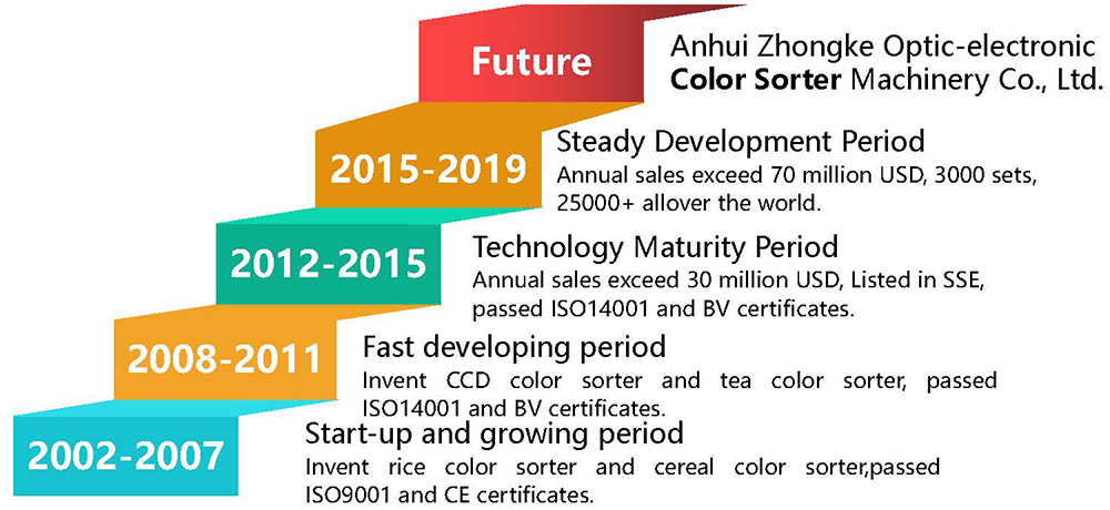 Anhui Zhongke Optic-electronic Color Sorter Machinery Co., Ltd. is located in Hefei, China, covering an area of 100,000 square meters, with a total investment of 30 million USD. It has digital production workshops of 27,000 square meters and a research building of 25,000 square meters. It is a high-tech enterprises of professional intelligent sorting equipment R&D, production and sales . After more than 23 years of development, it has become a large-scale intelligent sorting equipment production base with more than 900 employees and annual sales revenue of more than 150 million USD.